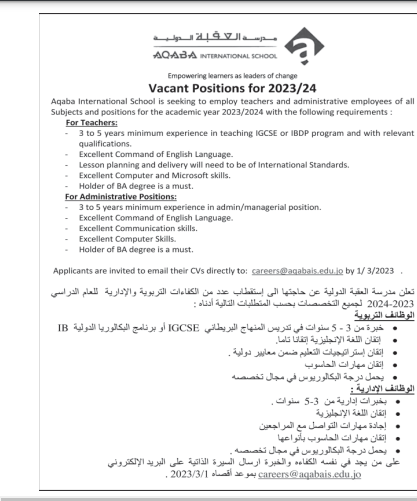 وظائف شاغرة لدى مدرسة العقبة الدولية