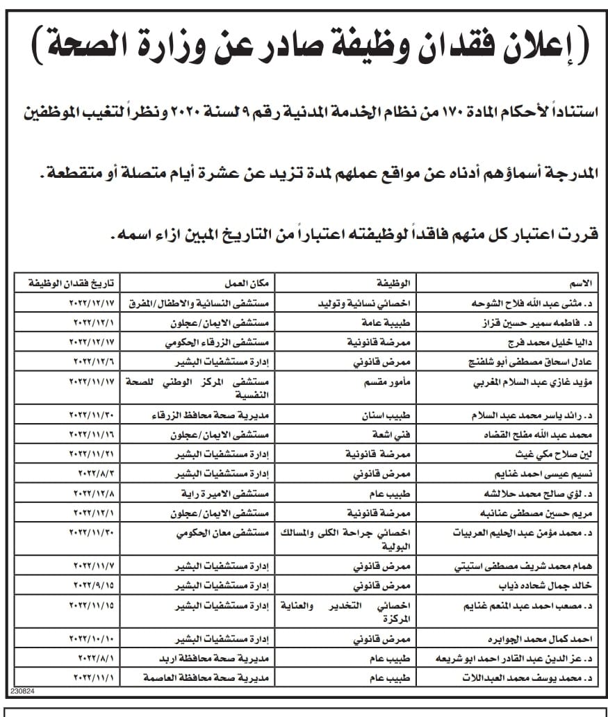 ويأتي ذلك، استنادا لأحكام المادة 170 من نظام الخدمة المدنية رقم (9) لسنة 2020. وتاليا الأسماء: