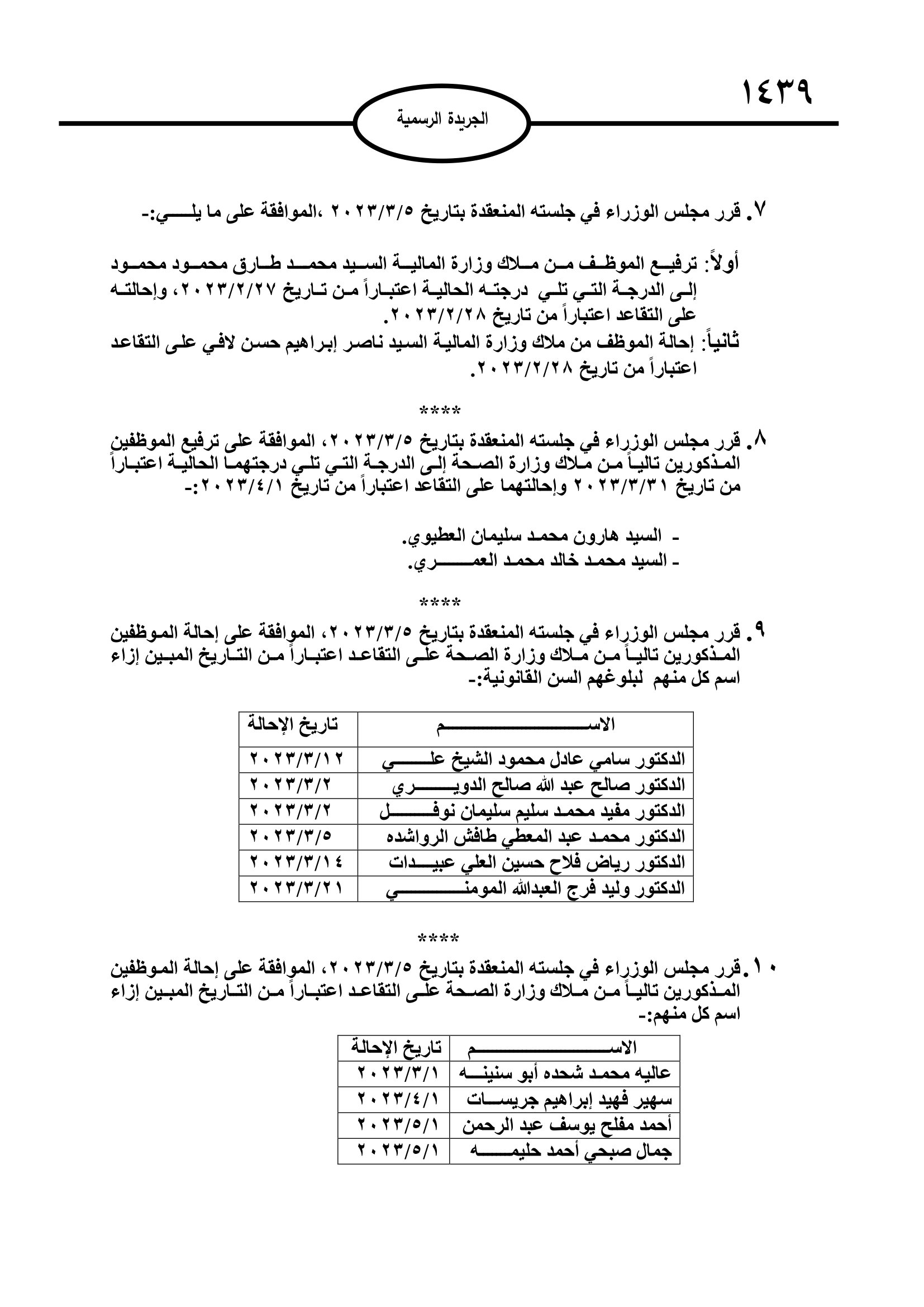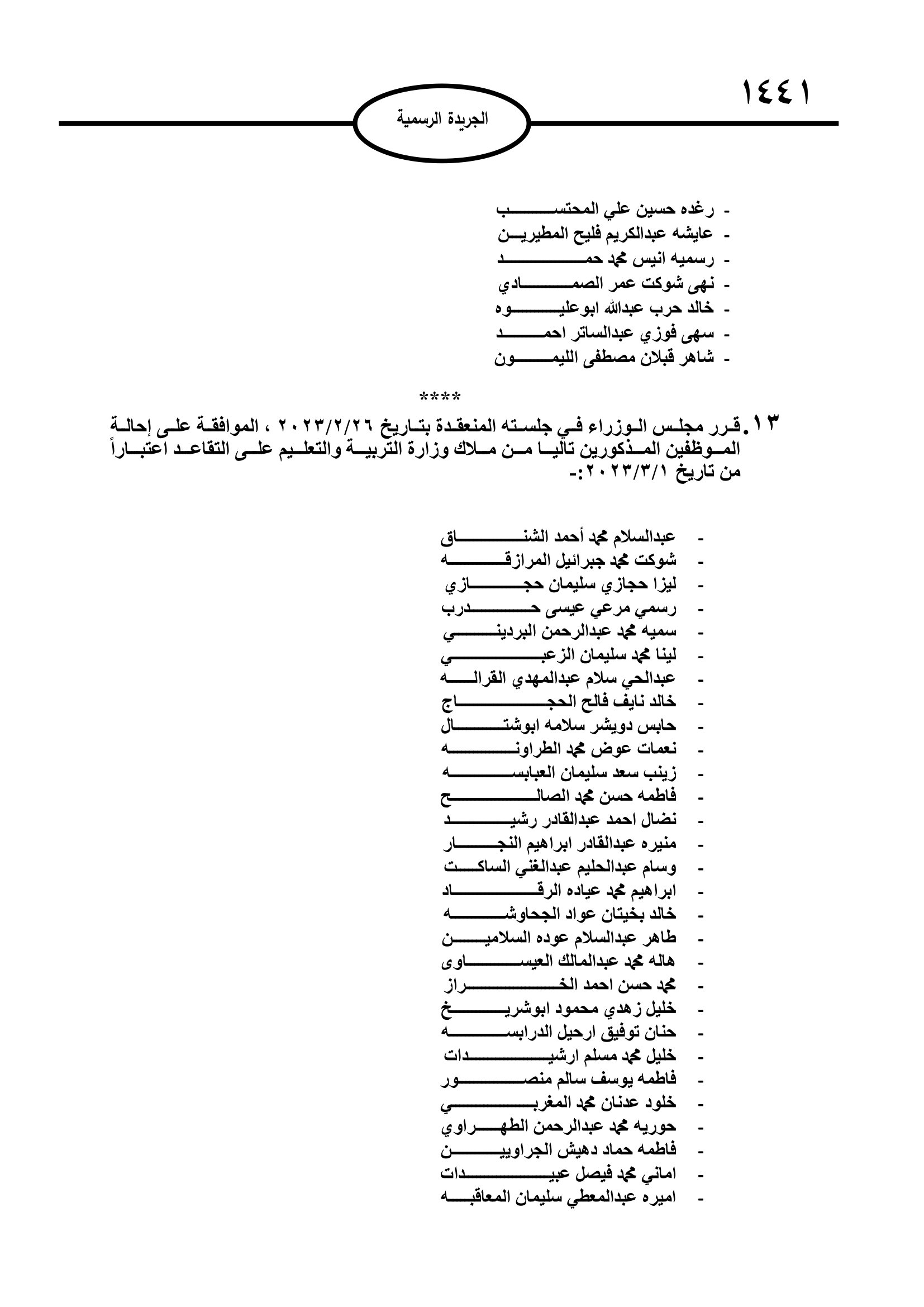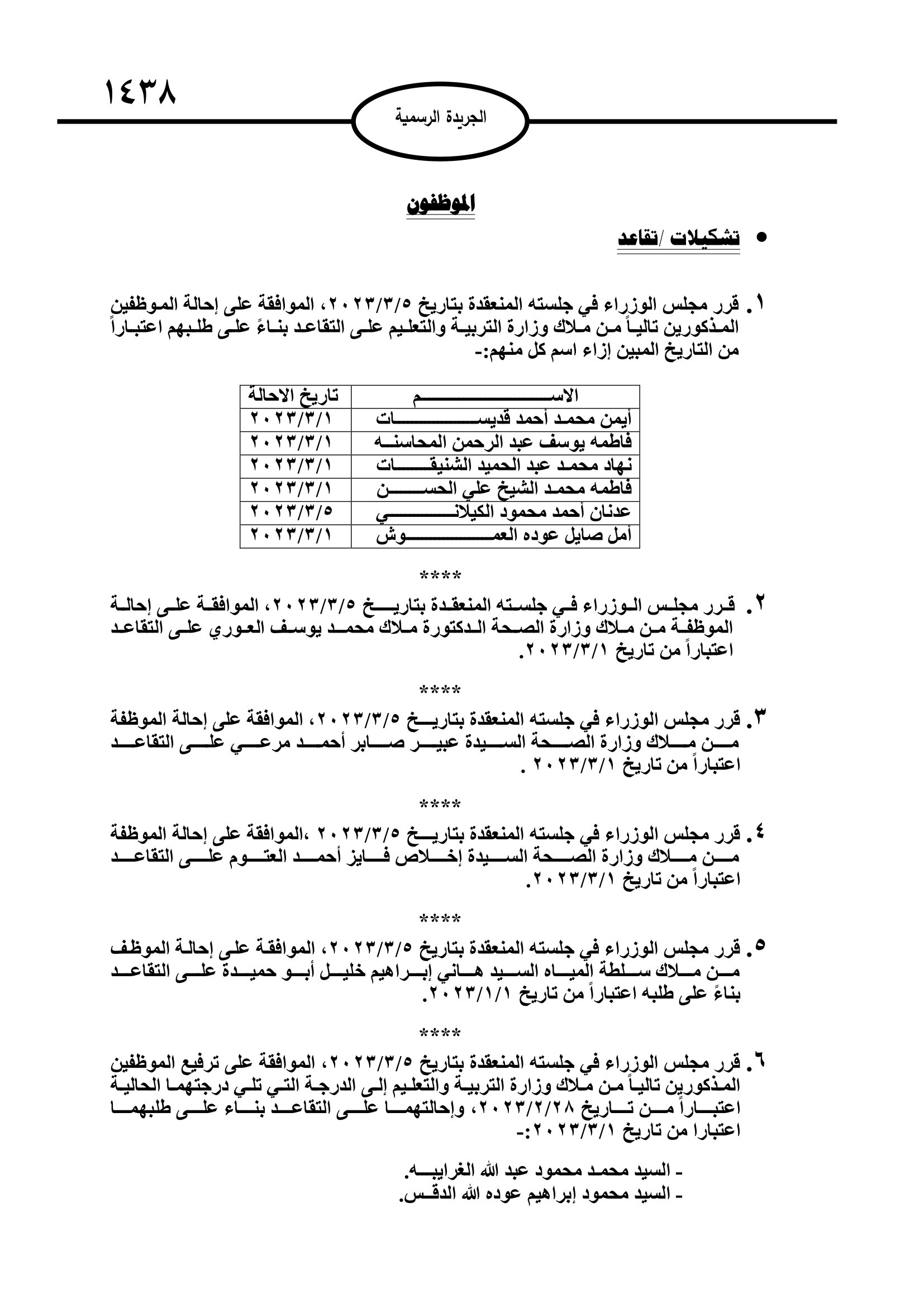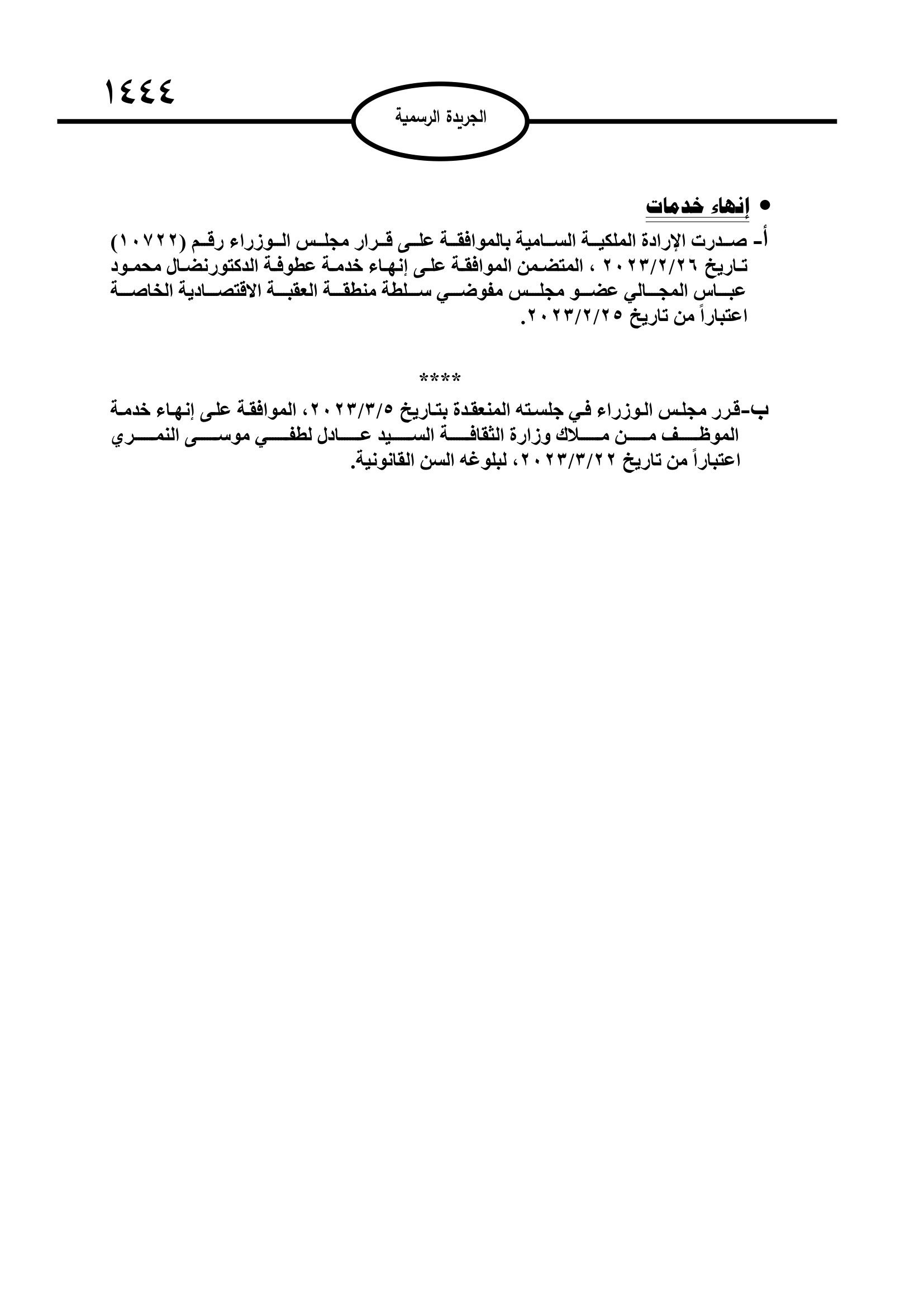 وكالة الناس –  صدر في عدد الجريدة الرسمية الصادرة اليوم الخميس، قرارات مجلس الوزراء باحالة عدد من موظفي الدولة الى التقاعد، وانهاء خدمات اخرين.