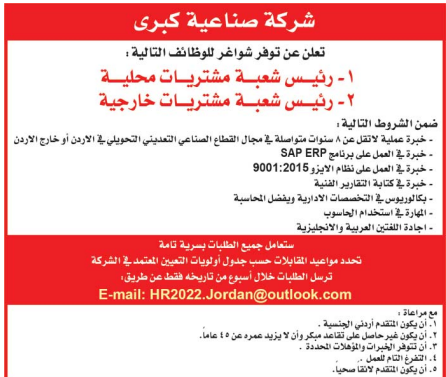 وظائف شاغرة لدى شركة صناعية