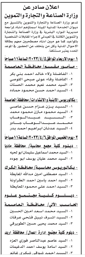 وظائف شاغرة ومدعوون للمقابلات الشخصية (أسماء) On أبريل 3, 2023 Share وكالة الناس – دعا ديوان الخدمة المدنية بالتنسيق مع عدد من الوزارات والمؤسسات الحكومية الأشخاص التالية لإجراء المقابلات الشخصية. كما أعلن عن وظائف شاغرة بالتنسيق مع الوزارات والمؤسسات الحكومية .