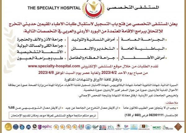 أعلن المستشفى التخصصي عن فتح باب التسجيل أمام الأطباء المقيمين حديثي التخرج للالتحاق ببرامج الإقامة المعتمدة من البورد الأردني والعربي في عدة تخصصات.