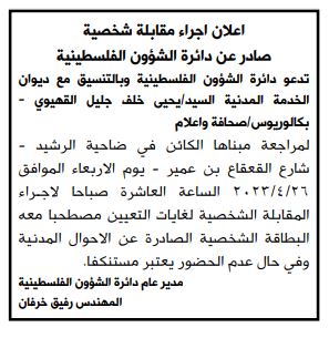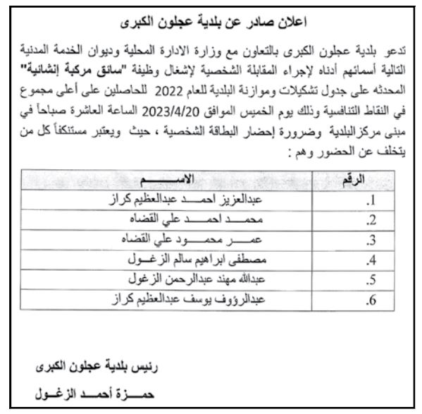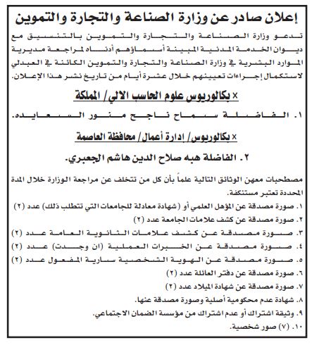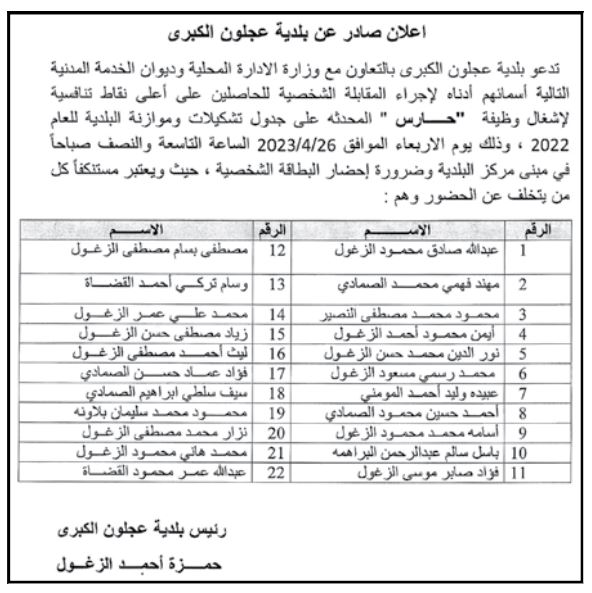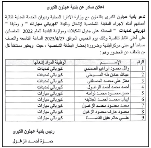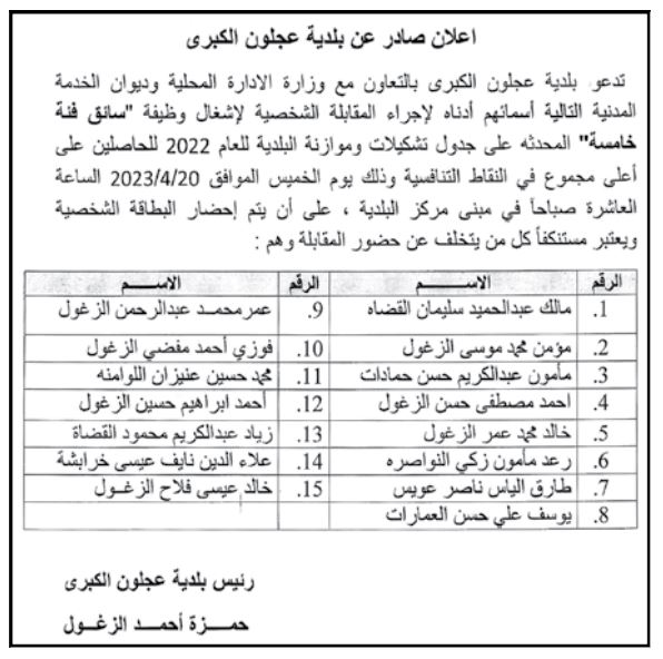 مدعوون لاستكمال إجراءات التعيين وإجراء المقابلات الشخصية .. أسـماء On أبريل 17, 2023 Share وكالة الناس – دعت وزارة الصناعة والتجارة والتموين اليوم الاثنين بالتنسيق مع ديوان الخدمة المدنية عددا من المرشحين لاستكمال إجراءات التعيين. في المقابل دعت بلدية عجلون الكبرى بالتنسيق مع ديوان الخدمة المدنية عددا من المرشحين لإجراء المقابلات الشخصية.