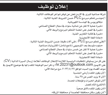 وظائف شاغرة لدى شركة صناعية