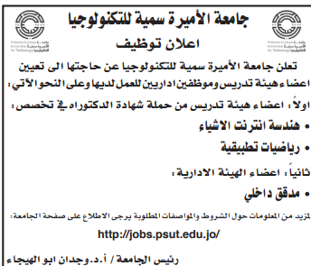 وظائف شاغرة لدى جامعة الاميرة سميه للتكنولوجيا