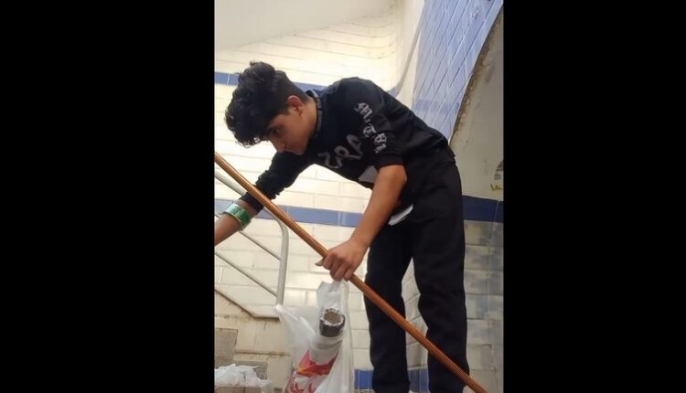 وبعد تصويره أكوام القمامة عند مدخل النفق وبداخله، بدأ “الكتبي” بجمعها ووضعها في أكياس ونقلها، وقام بكنس درج وأرضية النفق، ثم التقط مشاهد للنفق بعد تنظيفه.