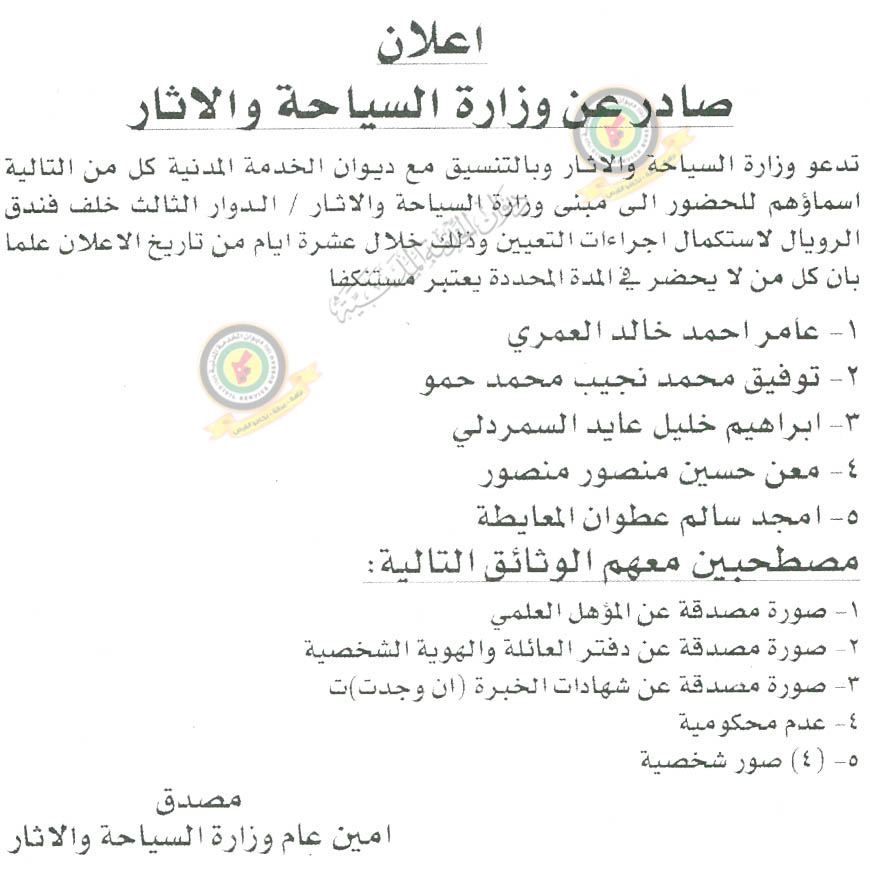 ودعت وزارة السياحة والاثار كل من التالية اسماؤهم ادناه الحضور الى مبنى الوزارة لاستكمال اجراءات التعيين خلال عشرة أيام من تاريخ الاعلان، مشيرة إلى ان كل من لا يحضر يعتبر مستنكفاً.