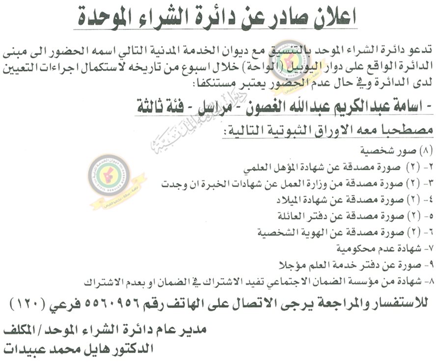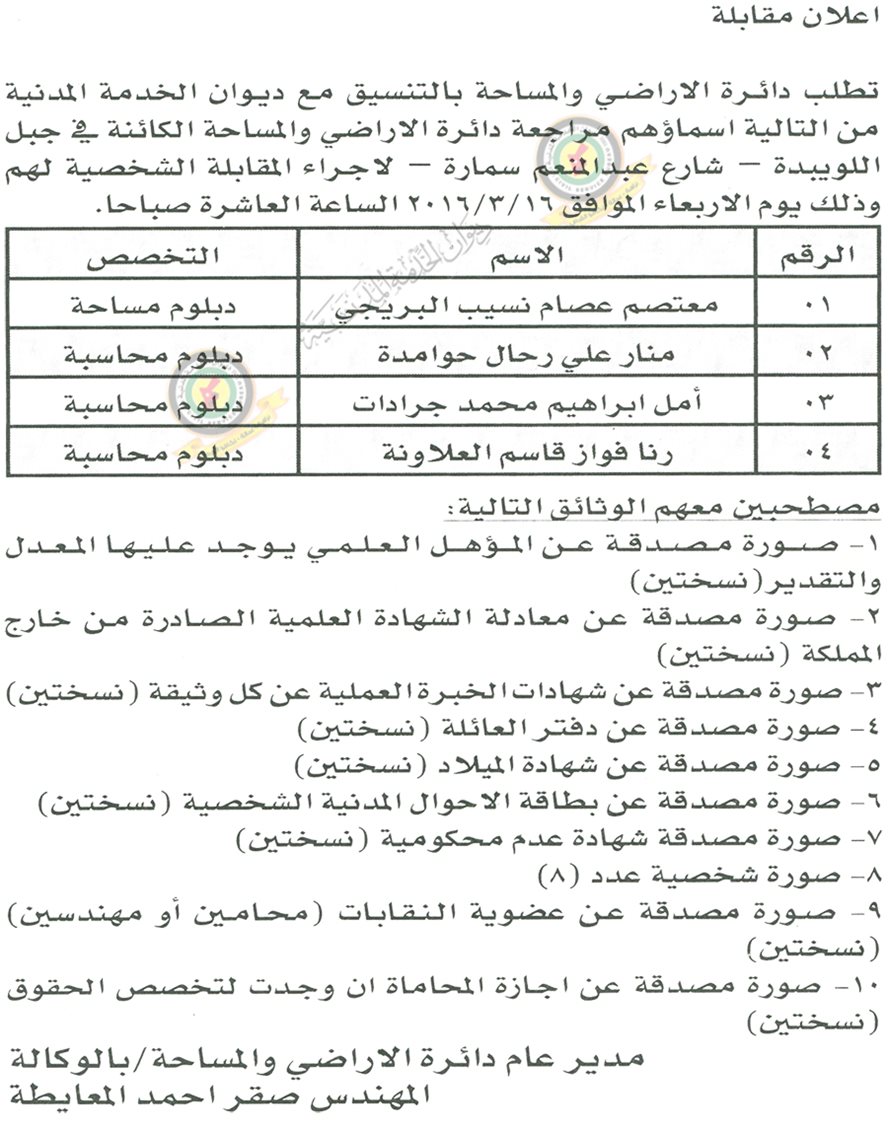 وكالة الناس – أعلن ديوان الخدمة المدنية بالتعاون مع مجموعة من المؤسسات حاجتها لموظفين، في حين طلبت مؤسسات أخرى التالية أسماؤهم لاستكمال إجراءات التعيين .