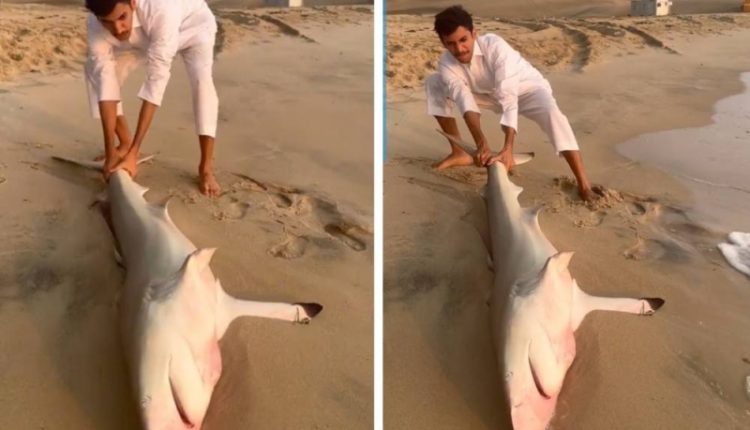 وثق مقطع فيديو متداول لحظة عثور مواطن على سمكة قرش ضخمة على أحد الشواطئ.