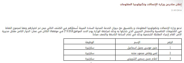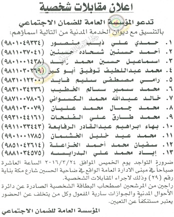 وكالة الناس – دعا ديوان الخدمة المدنية بالتعاون مع عدد من الوزارات والمؤسسات الحكومية، التالية اسماؤهم لاجراء المقابلات الشخصية وعقد الامتحان التنافسي لغايات التعيين، من يتخلف عن الحضور يعتبر مستنكفا عن التعيين، داعيا التالية اسماؤهم احضار اثبات للشخصية.