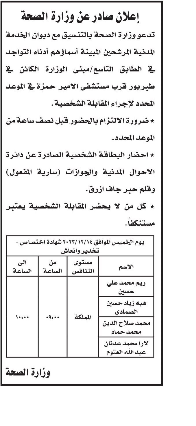 مدعوون للمقابلات الشخصية في الصحة ( أسماء ) On ديسمبر 12, 2023 Share وكالة الناس – دعت وزارة الصحة بالتنسيق مع ديوان الخدمة المدنية، مجموعة من المرشحين للمقابلات الشخصية.