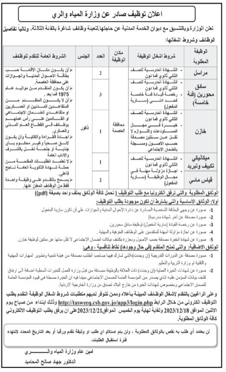 وظائف شاغرة في وزارة المياه والري