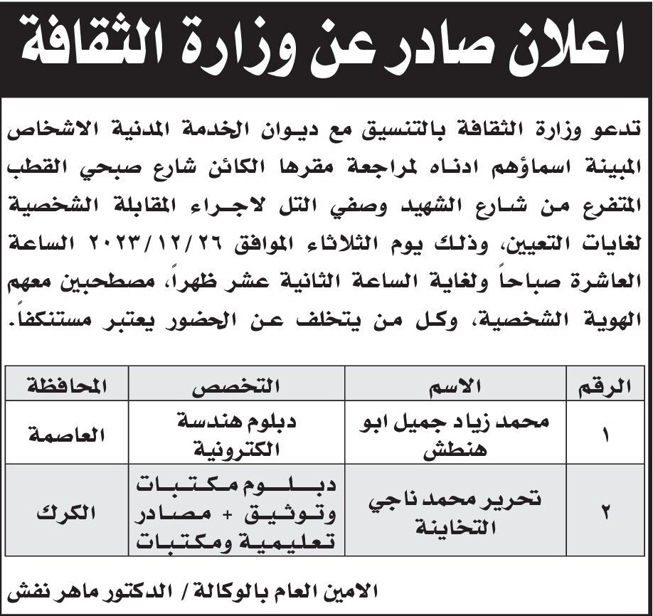مدعوون للمقابلات الشخصية في وزارة الثقافة