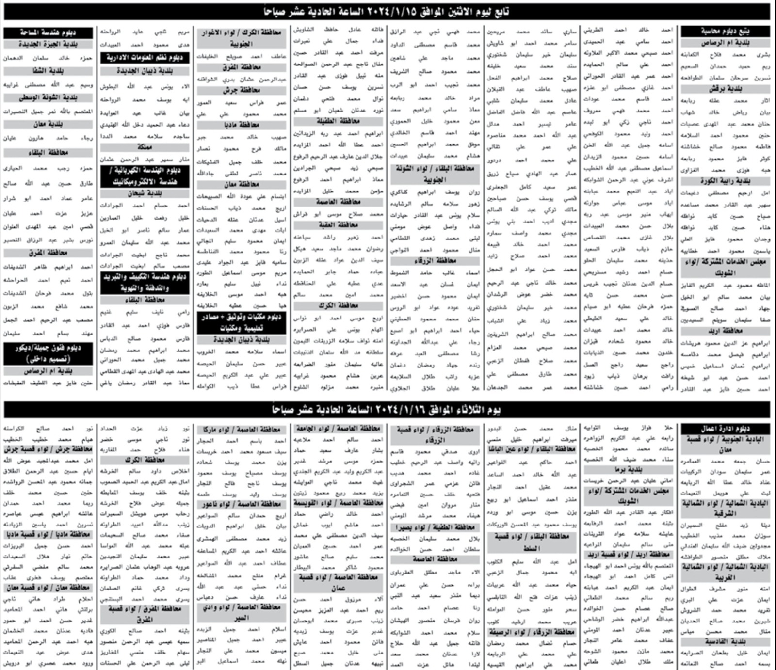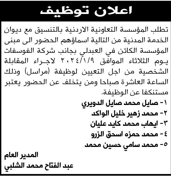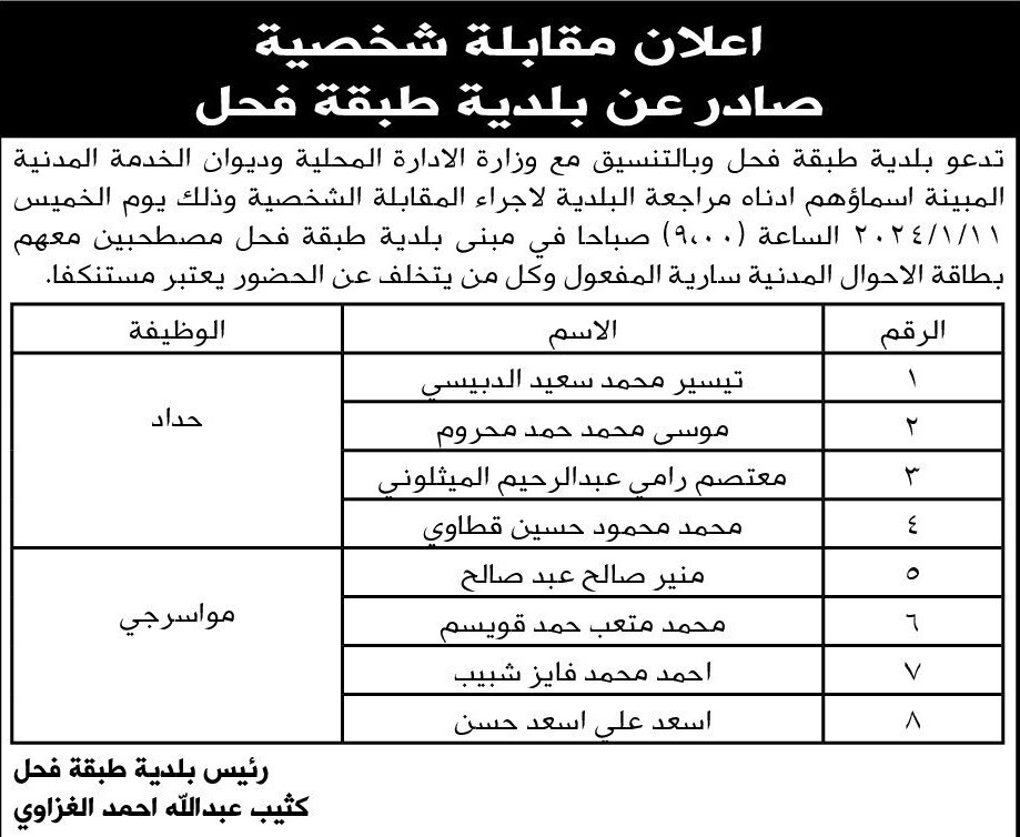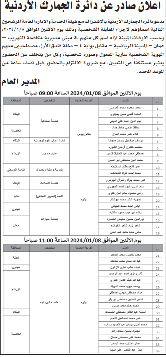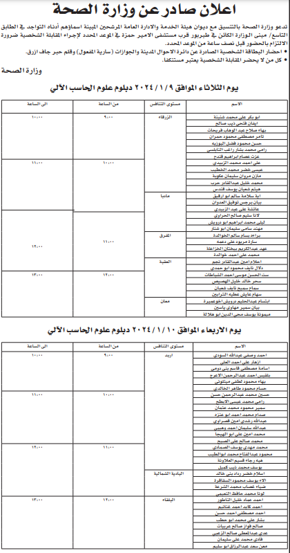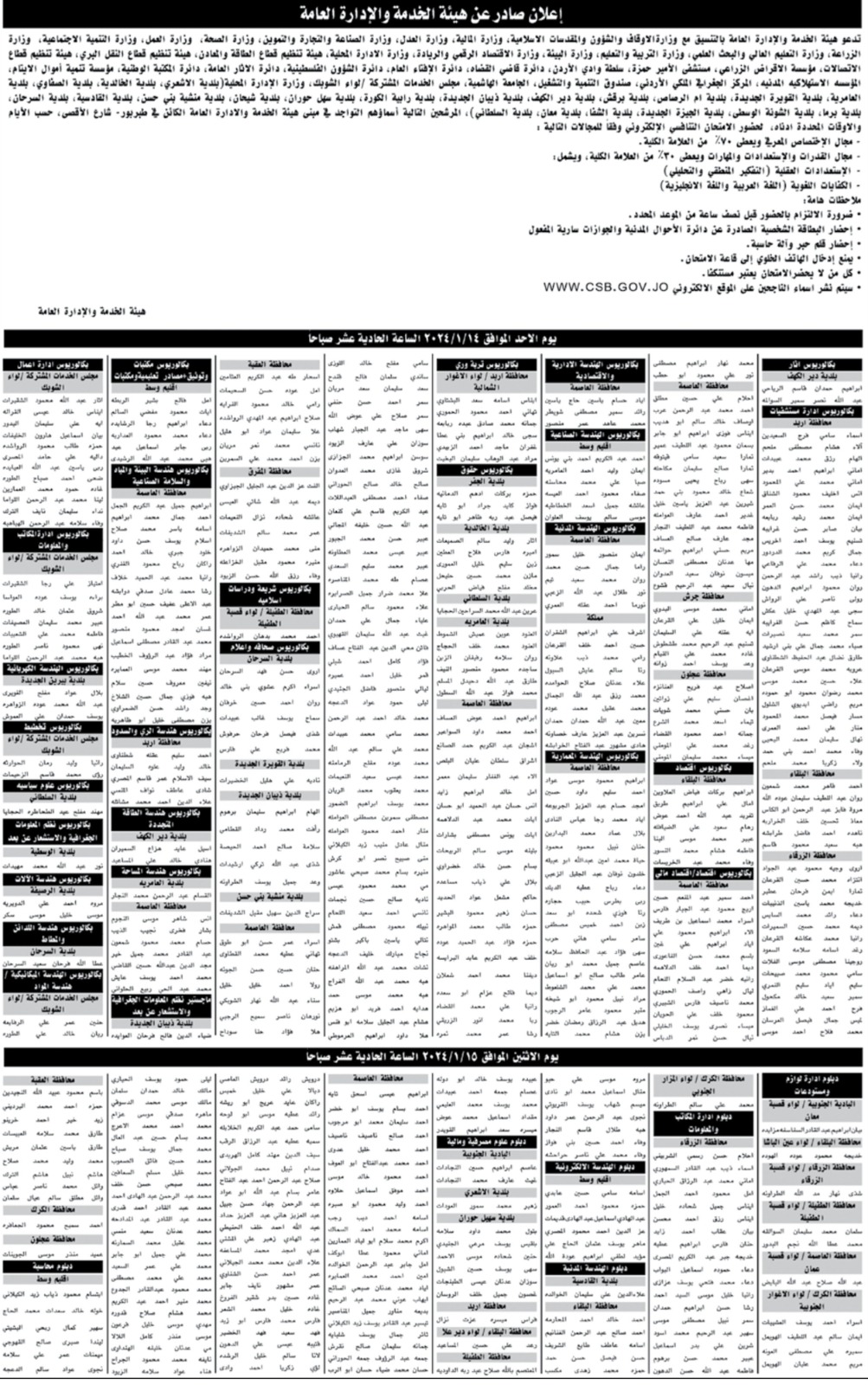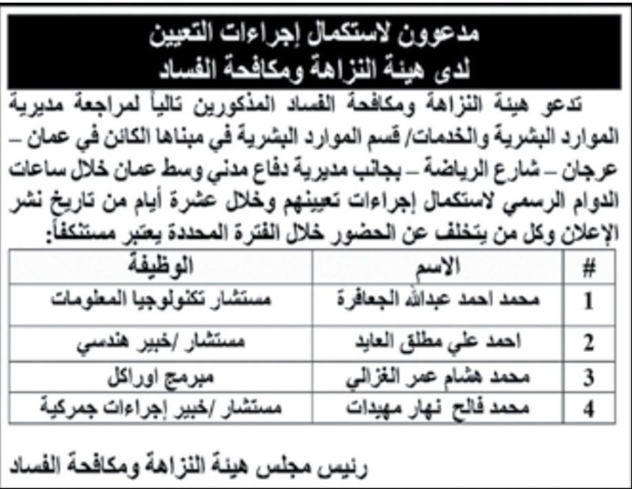 وكالة الناس – دعت عدد من المؤسسات والوزارات الحكومية، بالتنسيق مع هيئة الخدمة والادارة العامة المرشحين المبينة اسماؤهم أدناه لاجراء المقابلة الشخصية لاستكمال اجراءات التعيين.