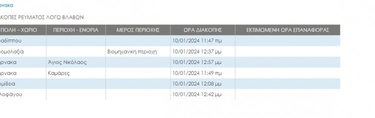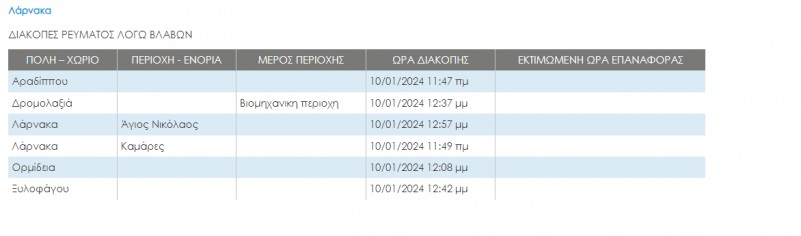 وفي مناطق أراديبو وكامارس وأجيوس نيكولاوس في لارنكا وأورميديا ومنطقة درومولاكسيا الصناعية في مقاطعة لارنكا، حدث انقطاع في إمدادات الكهرباء، بناءً على معلومات من الممثلة الصحفية لهيئة كهرباء قبرص، كريستينا. بابادوبولو، هذه بسبب سوء الأحوال الجوية وسيتم استعادتها إلى أقصى حد لها خلال الساعة أو الساعتين القادمتين.