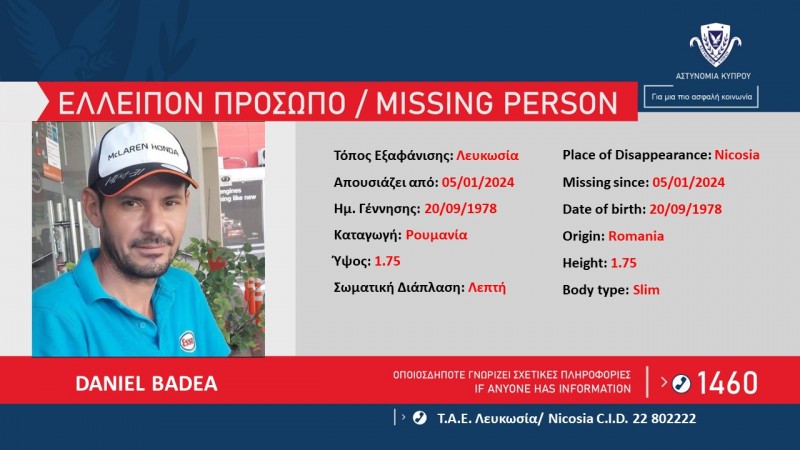 تناشد الشرطة الحصول على معلومات قد تساعد في تحديد مكان دانييل باديا، 45 عامًا، من رومانيا، المفقود من مقر إقامته في نيقوسيا منذ 5 يناير 2024.