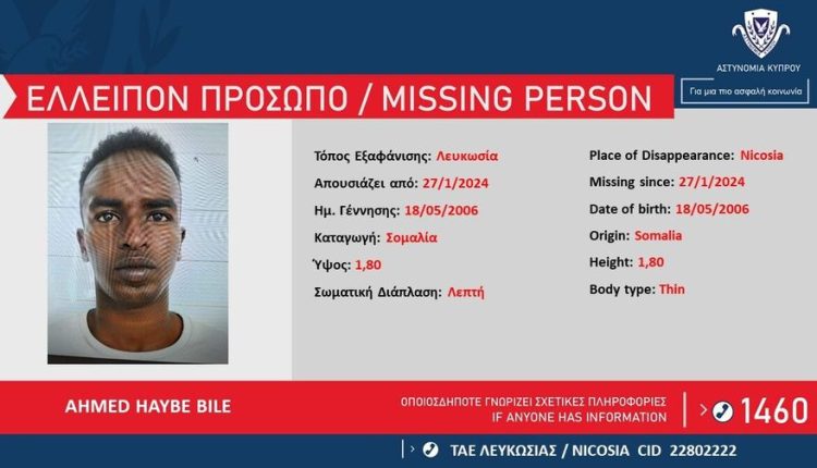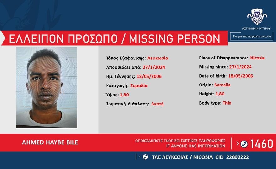 تطلب الشرطة معلومات يمكن أن تساعد في تحديد مكان أحمد هايبي بيلي، 17 عامًا، من الصومال، المفقود منذ 27/1/2023، من مكان إقامته في نيقوسيا.