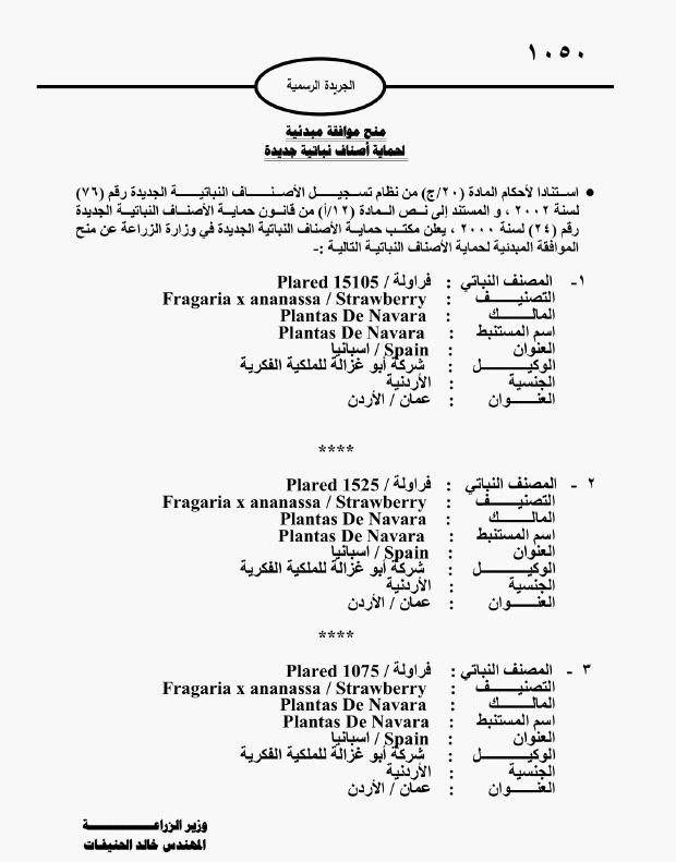 الحكومة تمنح الحماية لـ3 أصناف من الفراولة Last updated فبراير 29, 2024 Share وكالة الناس – منح مكتب حماية الأصناف النباتية الجديدة في وزارة الزراعة موافقة مبدئية لحماية 3 أصناف من الفراولة. وبحسب ما جاء في الجريدة الرسمية فإن هذا الموافقات منحت استنادا لاحكام المادة 20 / ج من نظام تسجيل الأصناف النباتية الجديدة رقم 76 لسنة 2002.