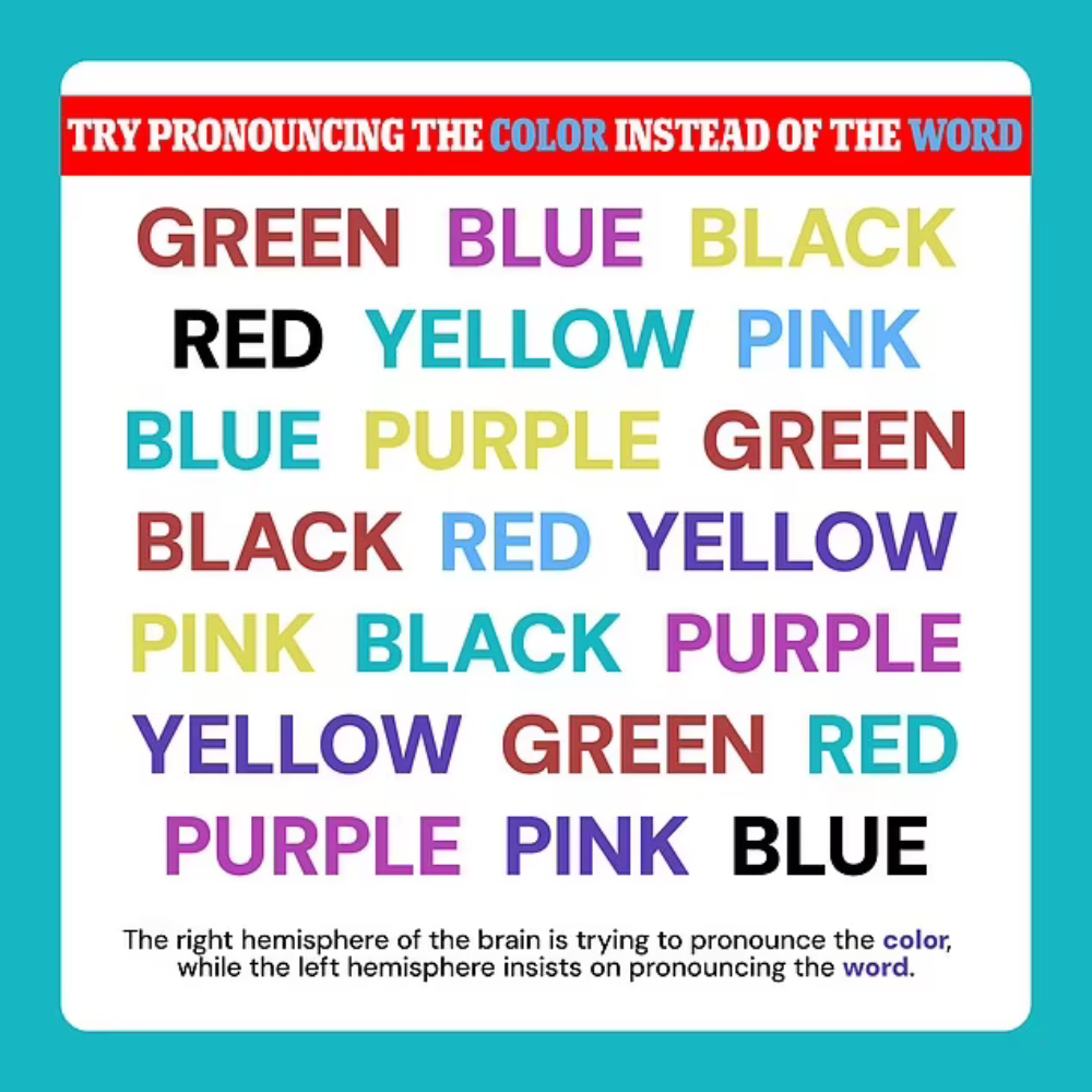 وذلك لأن النصف الأيمن من دماغك يحاول نطق اللون، بينما يصر النصف الأيسر على نطق الكلمة.