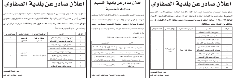 مدعوون للتعيين وشواغر (أسماء) On مايو 19, 2024 Share وكالة الناس – أعلنت عدة مؤسسات رسمية حاجتها لتعيين موظفين لديها في عدة تخصصات. وكما أعلنت مؤسسات عن حاجتها لإشغال شواغر وظيفية لديها. وتاليا التفاصيل والأسماء: