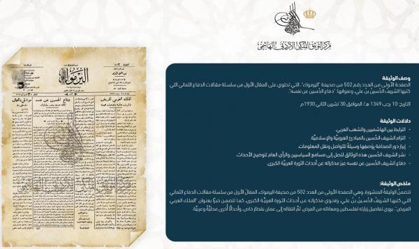 وأوضح المركز في بيان اليوم الاثنين، أن هذه المقالات تتضمّن مذكرات الشريف الحسين، التي شرح فيها بالتفصيل أحداث الثورة العربيّة الكبرى، وسلط الضوء على العديد من الجوانب التي لم تكن واضحة في المشهد السياسي آنذاك، مؤكدا قيمة هذه الوثائق الكبيرة للباحثين والمهتمين بتاريخ الأردن والمنطقة العربيّة.