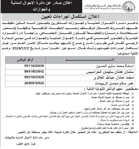 شواغر ومدعوون للتعيين في مؤسسات حكومية (أسماء) On ديسمبر 2, 2024 Share وكالة الناس – دعت وزارات ومؤسسات حكومية ،الاثنين، المرشحين التالية اسماؤهم الى الحضور لغاية استكمال اجراءات التعيين، وكما أعلنت مؤسسات أخرى عن توفر شواغر لديها. وتاليا الاسماء والتفاصيل: