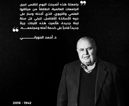 مع أمطار الخير وفي ذكرى رحيل الأسطورة المؤسس د. أحمد الحوراني ” أبا ماهر” ، يمرّ يوم 11 كانون الثاني من كل عام حاملا معه حزناً وفخراً … حزناً لفراقه جسداً في مثل هذا اليوم ، وفخرا بما أنجز، وبما تعاظم من إنجازات في الصروح العلمية والاقتصادية من بعده بفضل خلفه الصالح الدكتور ماهر والأستاذ عمر وأخواتهما وأم ماهر… فكانوا خير من يكملون المسيرة ويبقون على السيرة العطرة للمرحوم ويعاظمون الإنجازات.