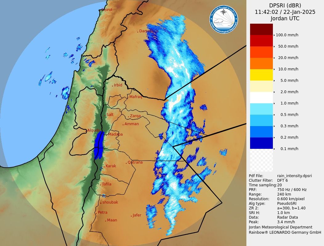 وكالة الناس – قالت إدارة الارصاد الجوية، إن أجزاء من محافظات معان، والزرقاء، وجنوب شرق العاصمة، والأجزاء الوسطى من محافظة المفرق، تشهد حاليًا هطولات مطرية تتراوح بين الخفيفة والمتوسطة، وفقًا لصور رادار الطقس الصادرة عن إدارة الأرصاد الجوية.