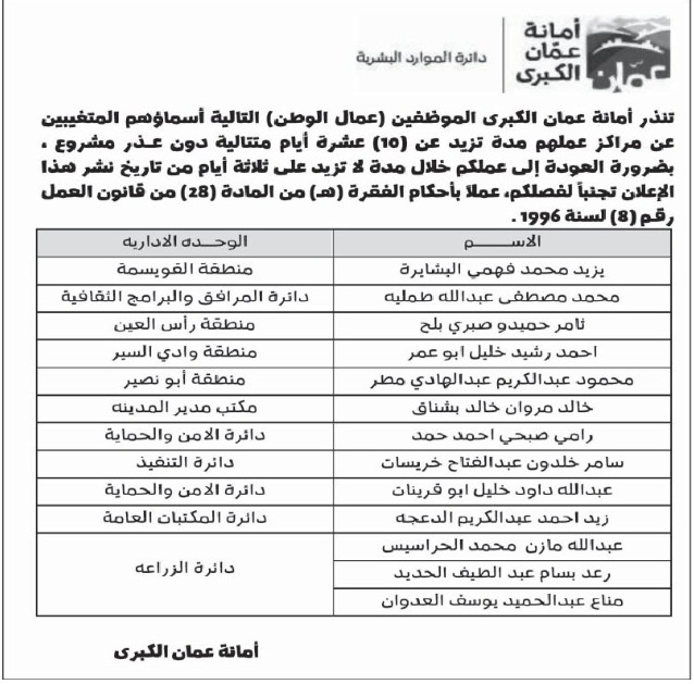 الأمانة تنذر عمال وطن بالفصل (أسماء) On يناير 27, 2025 Share وكالة الناس – أنذرت أمانة عمان الكبرى،اليوم الاثنين، 13 عامل وطن ، بالعودة إلى عملهم خلال 3 أيام، وإلا سيتم فصلهم نتيجة تغيبهم عن العمل لمدة تزيد عن 10 أيام دون عذر مشروع. وذلك عملا بأحكام الفقرة “هـ” من المادة “28” من قانون العمل رقم “8” لسنة 1996. وتاليا الأسماء ..