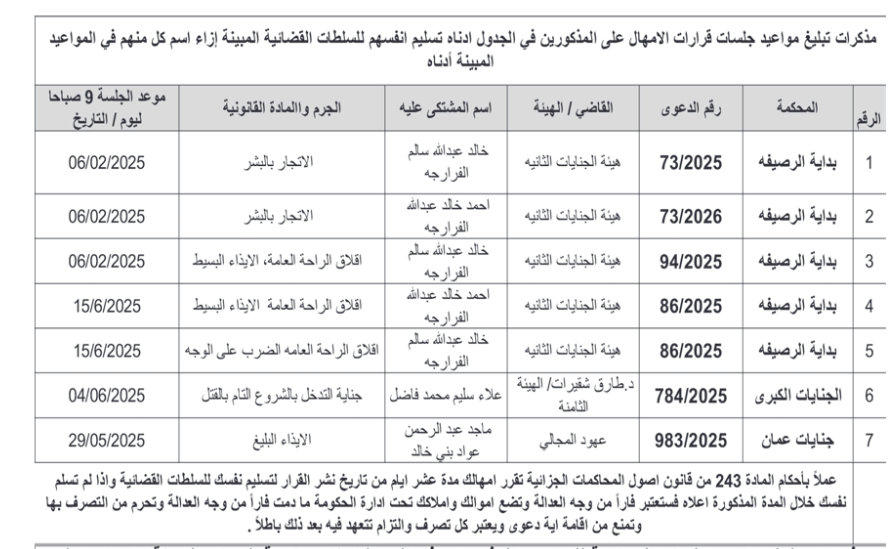 مذكرات تبليغ مواعيد جلسات محاكمات لأردنيين (أسماء) Last updated مايو 27, 2025 Share وكالة الناس -صدرت اليوم الثلاثاء، مذكرات تبليغ مواعيد جلسات محاكمات لمشتكى عليهم بتهم مختلفة وقرارات إمهال لحضور جلسات محاكمة. وطلبت المذكرات من المذكورين في الجداول أدناه مراجعة المحاكم المبينة ازاء اسم كل منهم في المواعيد المبينة أدناه. وتاليا الأسماء والمواعيد: