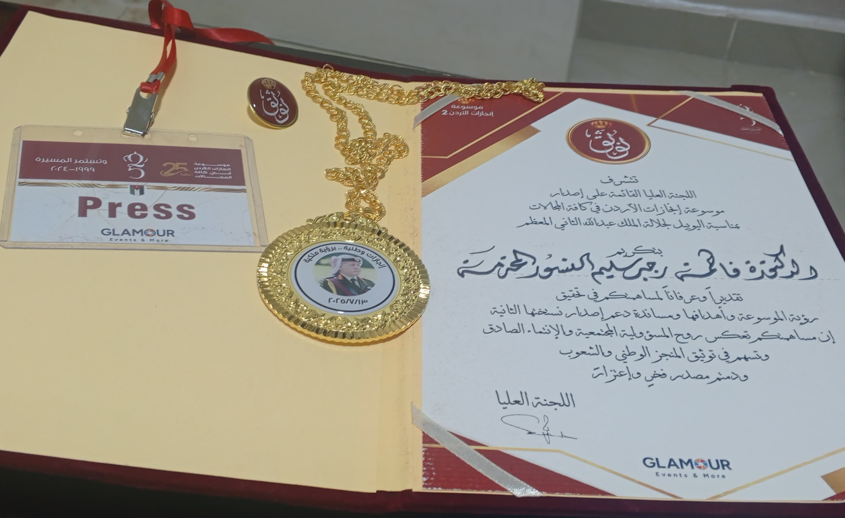 وكالة الناس -تحت رعاية رئيس الديوان الملكي الهاشمي يوسف العيسوي، وبدعوة من الدكتور حازم قشوع، تم تكريم الدكتورة فاطمة رجب النسور كسفيرة للتراث الأردني.