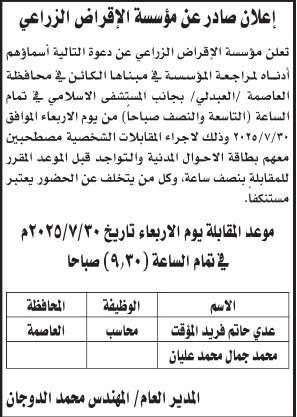 وظائف حكومية شاغرة ومدعوون للمقابلات الشخصية (أسماء) On يوليو 21, 2025 Share وكالة الناس – أعلنت وزارة الصناعة والتجارة والتموين، اليوم الاثنين، عن حاجتها لتعبئة وظائف شاغرة. كما دعت مؤسسة الاقراض الزراعي التالية أسماؤهم لاجراء المقابلة الشخصية: