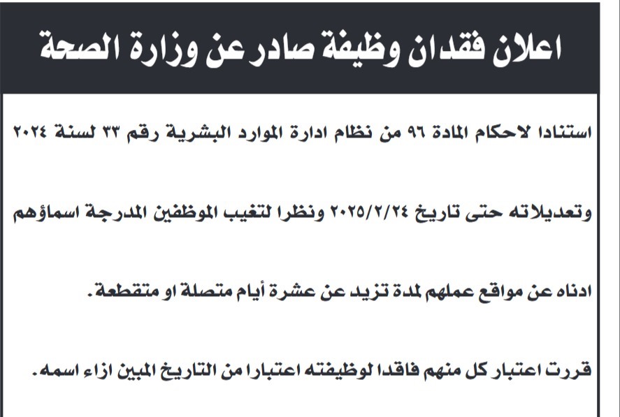 فاقدون لوظائفهم في الصحة (أسماء) On سبتمبر 10, 2025 Share وكالة الناس – أنهت وزارة الصحة خدمات عدد من موظفيها بسبب تغيبهم عن العمل لأكثر من 10 أيام متتالية أو متقطعة دون عذر. ويأتي هذا الإجراء بناءً على المادة (96) من نظام إدارة الموارد البشرية. وتاليا الأسماء: