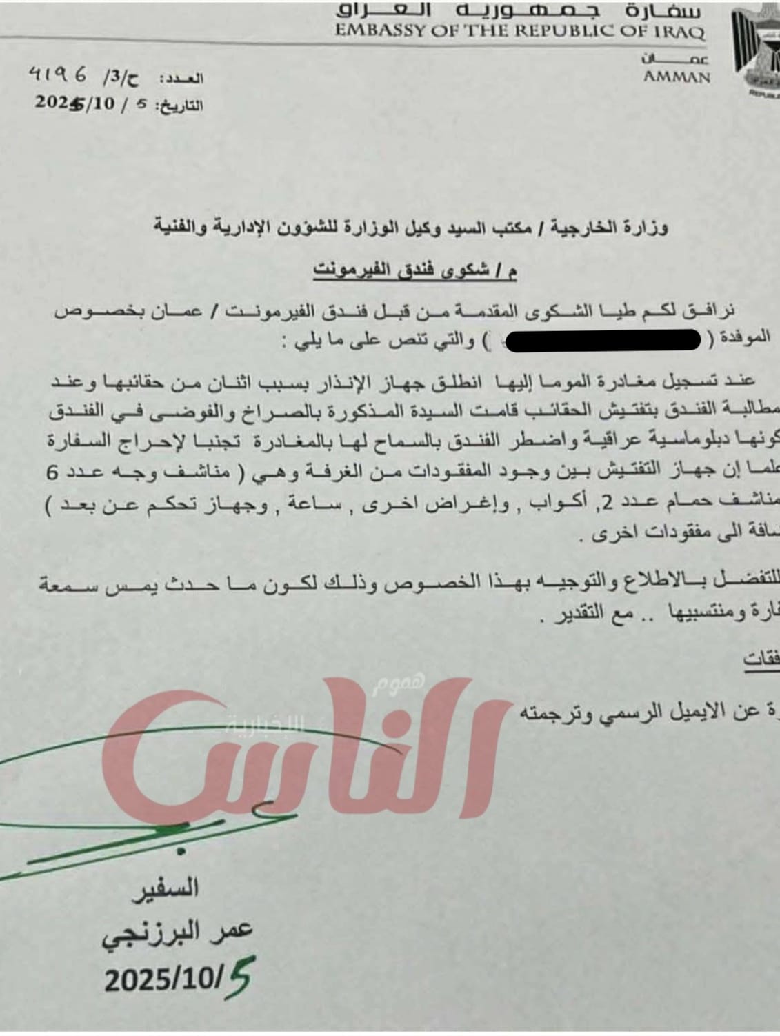 فندق الفيرمونت – عمّان يتقدّم بشكوى ضد دبلوماسية عراقية بتهمة سرقة مقتنيات من غرفتها.. وثيقة