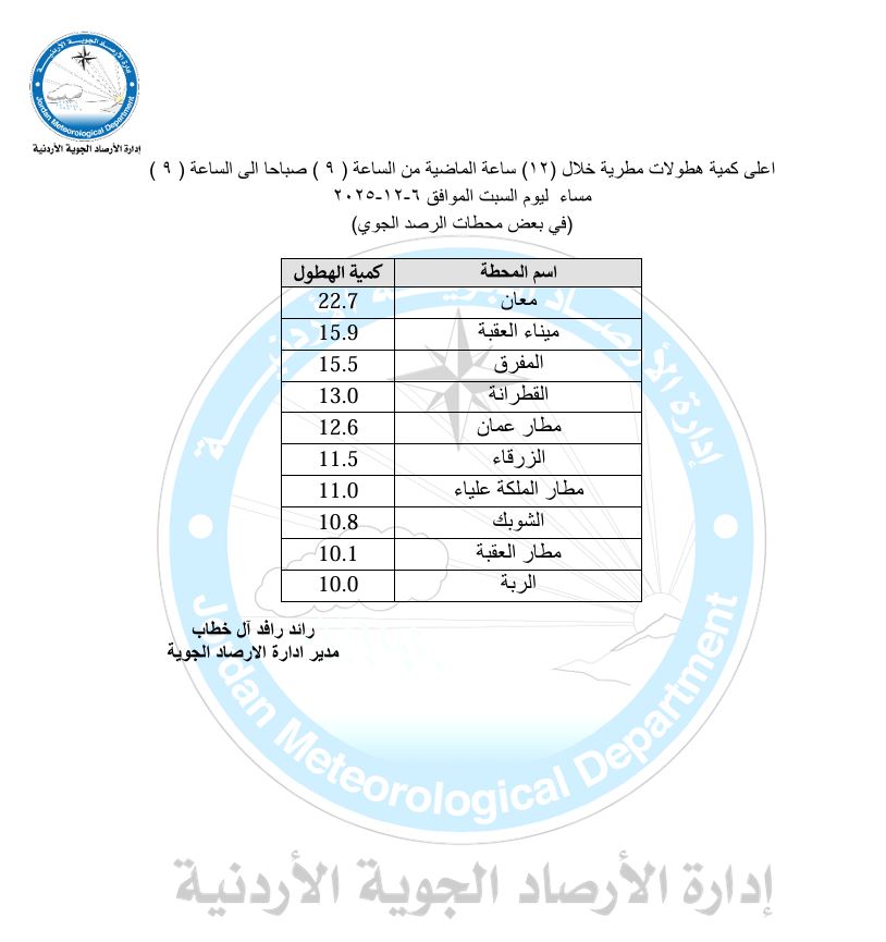 ووفق آل خطاب كانت محافظة معان الأعلى بـ 22.7 ملم، تلاها ميناء العقبة بـ 15.9 ملم، ثم المفرق 15.5 ملم، والقطرانة 13.0 ملم، ومطار عمان 12.6 ملم، ثم الزرقاء 11.5 ملم، ومطار الملكة علياء 11.0 ملم، ثم الشوبك 10.8 ملم، ومطار العقبة 10.1 ملم، والربة 10.0 ملم.