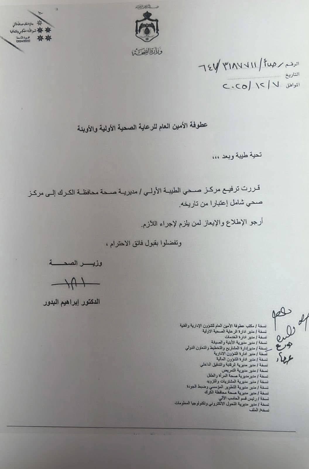 وكالة الناس – نتقدم نحن عشائر البطوش من معالي وزير الصحة المكرّم الدكتور ابراهيم البدور بأسمى آيات الشكر والتقدير والعرفان على الإستجابة المباركة والمتمثلة بالموافقة على ترفيع مركز صحي بلدتنا الطيبة من مركز طبي أوليّ الى مركز طبي شامل .