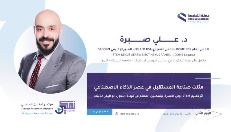 شارك مدير عام مجموعة دوم التعليمية للنشر والتوزيع والاستشارات الأكاديمية الدكتور علي صبرة متحدثًا رئيسيًا في مؤتمر “تمكين العلمي 2026”، الذي نظمته شركة عطاء التعليمية في المملكة العربية السعودية، حيث قدّم ورقة علمية بعنوان: “مثلث صناعة المستقبل في عصر الذكاء الاصطناعي”، تناول فيها أبرز التحولات التي يشهدها قطاع التعليم في ظل التطور المتسارع للتقنيات الحديثة.