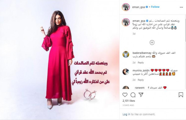 وعلّقت إيمان على الصورة قائلةً: “وبنعمته تتم الصالحات… تم عقد قراني على من اختاره الله لي زوجاً صالحاً، وأسأل الله التوفيق لي ولكم”، لكنها لم تكشف عن هوية العريس أو اسمه… وانهالت على الصورة التبريكات وعبارات التهنئة من المعلّقين الذين تمنّوا لها دوام السعادة.
