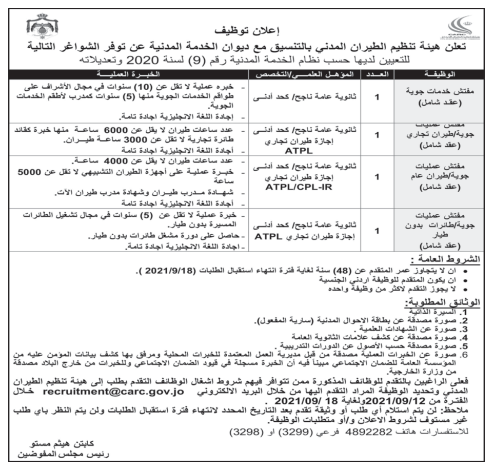 وظائف شاغرة لدى هيئة تنظيم الطيران المدني بالتنسيق مع ديوان الخدمة Last updated سبتمبر 12, 2021 Share وكالة الناس –
