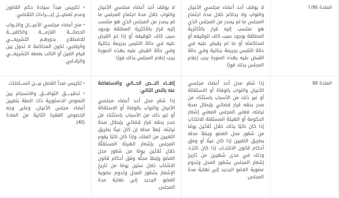 14- قُدمت توصية بتعديل المادة (86 /1) من الدستور المتعلقة بحصانة أعضاء مجلسي الأعيان والنواب، وذلك بأن يقتصر نطاقها على التوقيف دون المحاكمة أثناء جلسات المجلس، تكريسًا لمبدأ سيادة حكم القانون وعدم تعطيل إجراءات التقاضي ومنح أعضاء مجلسي الأعيان والنواب الحصانة اللازمة والكافية للاضطلاع بدورهم التشريعي والرقابي، لكون المحاكمة لا تحول بين قيام العين أو النائب بعمله التشريعي والرقابي.