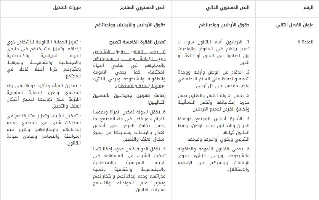 كما شملت اللجنةُ في تعديلاتها الأشخاصَ ذوي الإعاقة، إذ أعادت صياغة الفقرة (5) من المادة (6) من الدستور لتأكيد ضمان الدولة لحقوقهم الأساسية، وعلى النحو التالي: (يحمي القانون حقوق الأشخاص ذوي الإعاقة ويعزز مشاركتهم واندماجهم في مناحي الحياة المختلفة، كما يحمي الأمومة والطفولة والشيخوخة ويرعى النشء ويمنع الإساءة والاستغلال)