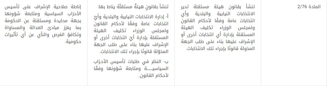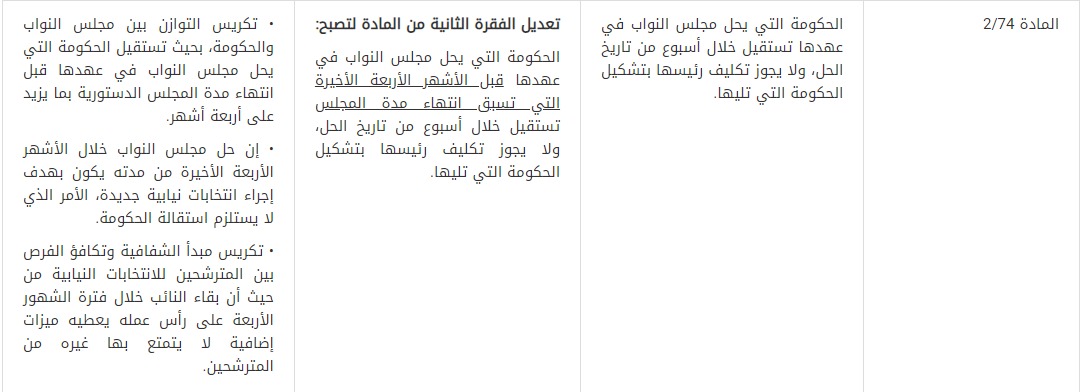 11- قُدمت توصية بتعديل المادة (2/74) مفادها أن الحكومة التي يحل مجلس النواب في عهدها قبل الأشهر الأربعة الأخيرة التي تسبق انتهاء مدة المجلس تستقيل خلال أسبوع من تاريخ الحل ولا يجوز تكليف رئيسها بتشكيل الحكومة التي تليها، ومبرر هذا التعديل تكريس التوازن بين مجلس النواب والحكومة، وذلك بأن تستقيل الحكومة التي يحل مجلس النواب في عهدها قبل انتهاء مدة المجلس الدستورية بما يزيد على أربعة أشهر، لكون حل المجلس خلال الأشهر الأربعة الأخيرة من مدته يكون بهدف إجراء انتخابات نيابية جديدة، الأمر الذي لا يستلزم استقالة الحكومة. بالإضافة إلى أن هذا التعديل يكرس مبدأ الشفافية وتكافؤ الفرص بين المترشحين للانتخابات النيابية من حيث أن بقاء النائب خلال فترة الأشهر الأربعة على رأس عمله يعطيه ميزات إضافية لا يتمتع بها غيره من المترشحين.