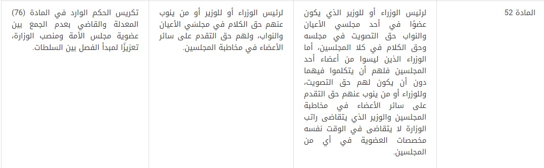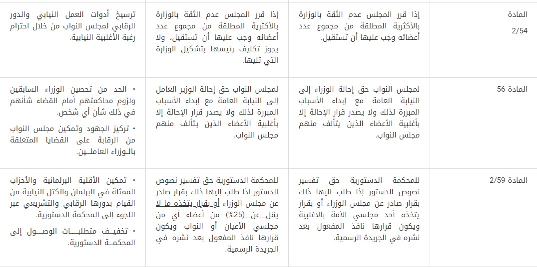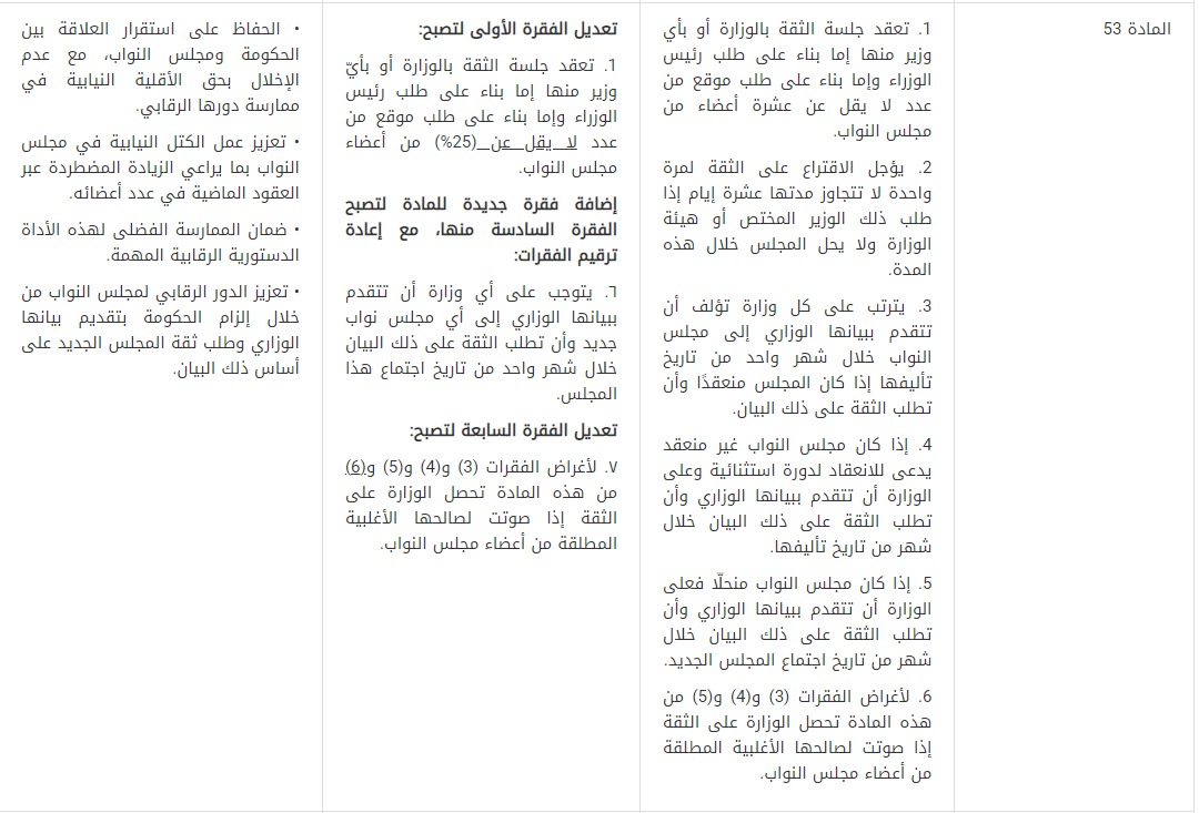 3- قُدمت توصية بإضافة فقرة جديدة للمادة (53)، توجب على أيّ وزارة أن تتقدم ببيانها الوزاري إلىأيّ مجلس نواب جديدوأن تطلب الثقة على ذلك البيان خلال شهر واحد من تاريخ اجتماع هذا المجلس، وذلك لتعزيز الدور الرقابي لمجلس النواب من خلال طلب الحكومة ثقةَ المجلس الجديد على أساس بيانها الوزاري.