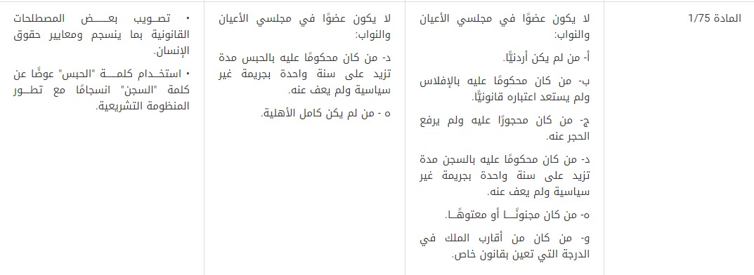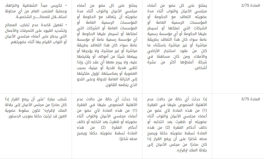 12- قُدمت توصية بتعديل المادة (2/75)من الدستور بحيث يمتنع على كل عضو من أعضاء مجلسي الأعيان والنواب أثناء مدة عضويته أن يتعاقد مع الحكومة أو المؤسسات الرسمية العامة أو المؤسسات العامة أو الشركات التي تملكها أو تسيطر عليها الحكومة أو أي مؤسسة رسمية عامة أو مؤسسة عامة سواء كان هذا التعاقد بطريقة مباشرة أو غير مباشرة، ولا يؤجرها أو يبيعها شيئًا من أمواله، أو يقايضها عليه، ولا يبرم معها أي عقد كان، وإذا تلقى هدية نقدية أو عينية بسبب العضوية أو بمناسبتها، تؤول ملكيتها إلى الخزانة العامة للدولة وعلى النحو الذي ينظمه القانون، وذلك تكريسًا لمبدأ الشفافية والنزاهة، ولحماية المنصب العام من أي محاولة استغلال للمصالح الشخصية، بالإضافة إلى تفعيل قاعدة عدم تضارب المصالح وتشديد القيود على التصرفات والأعمال التي يحظر على أعضاء مجلسي الأعيان والنواب القيام بها أثناء عضويتهم.