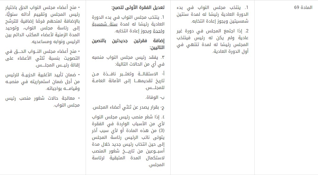 7- قُدمت توصية بتعديل المادة (1/69) من الدستور لتصبح مدة رئاسة مجلس النواب سنة شمسية واحدة، مع تقرير الحق لأعضاء مجلس النواب بالتصويت على فقدان رئيس مجلس النواب لمنصبه، ومعالجة حالة وفاة رئيس مجلس النواب أو استقالته. فإن شغر منصب رئيس المجلس بسبب الاستقالة أو الوفاة أو لأيّ سبب من الأسباب يتولى نائب الرئيس رئاسة المجلس لحين انتخاب رئيس جديد خلال مدة أسبوعين من تاريخ شغور المنصب لاستكمال المدة المتبقية للرئاسة. وجاءت مبررات هذا التعديل لمنح أعضاء مجلس النواب الحق في اختيار رئيس المجلس وتقييم أدائه سنويًّا، ومنحهم فرصًا إضافية للترشح إلى رئاسة مجلس النواب، وتوحيد المدة الزمنية لأعضاء المكتب الدائم بين الرئيس ونوابه ومساعديه. بالإضافة إلى منح أعضاء مجلس النواب الحق في التصويت بنسبة ثلثي الأعضاء على إقالة رئيس المجلس، وذلك لضمان تأييد الأغلبية الحزبية للرئيس من أجل ضمان استمراريته في منصبه وقيامه بواجباته. كما عالج التعديل حالات شغور منصب رئيس مجلس النواب والأثر الدستوري المترتب عليه.