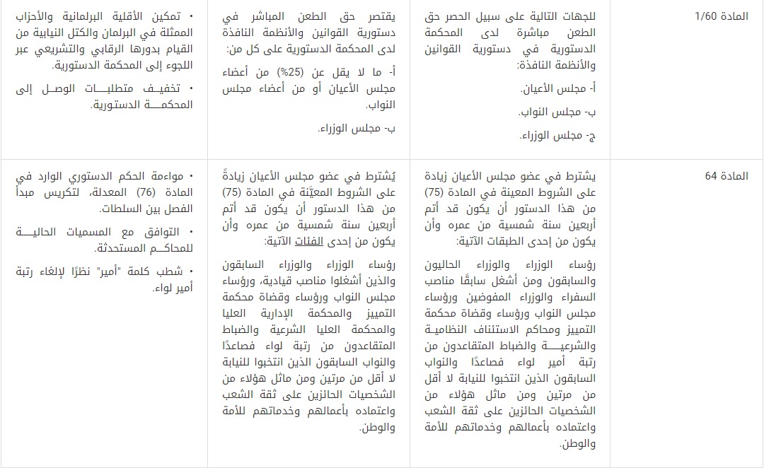 6- قُدمت توصية بتعديل المادة (2/59) والمادة (1/60) من الدستور المتعلقتين بحق مجلسَي الأعيان والنواب بطلب تفسير الدستور والطعن المباشر بعدم دستورية القوانين والأنظمة النافذة لدى المحكمة الدستورية، ليثبت الحق بالطعن وطلب التفسير لما لا يقل عن (25%) من عدد أعضاء مجلسي الأعيان أو النواب، وذلك بهدف تمكين الأقلية البرلمانية والأحزاب الممثلة في البرلمان والكتل النيابية من القيام بدورها الرقابي والتشريعي عبر اللجوء إلى المحكمة الدستورية، وتخفيف متطلبات الوصول إلى المحكمة.