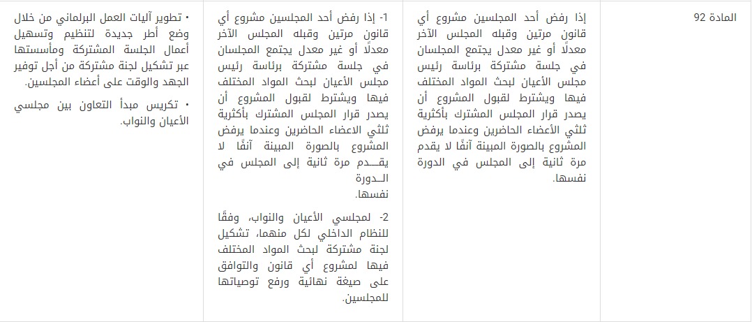 15- قُدمت توصية بتعديل المادة (92) من الدستور بحيث يُمنح مجلسا الأعيان والنواب الحق في تشكيل لجنة مشتركة، وفقًا للنظام الداخلي لكل منهما، لبحث المواد المختلف فيها لمشروع أي قانون والتوافق على صيغة نهائية ورفع توصياتها للمجلسين، وذلك لتطوير آليات العمل البرلماني من خلال وضع أطر جديدة لتنظيم وتسهيل أعمال الجلسة المشتركة ومأسستها عبر تشكيل لجنة مشتركة من أجل توفير الجهد والوقت على أعضاء المجلسين، وتكريس مبدأ التعاون بينهم.