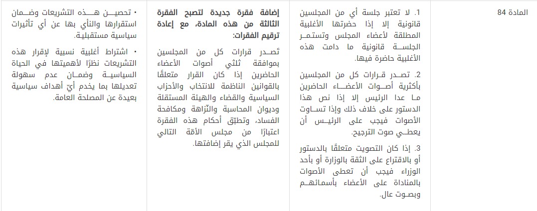 13- قُدمت توصية بتعديل المادة (84) من الدستور بإضافة فقرة جديدة تتعلق بصدور قرارات كل من المجلسين بموافقة ثلثي أصوات الأعضاء الحاضرين إذا كان القرار متعلقًا بالقوانين الناظمة للانتخاب والأحزاب السياسية والقضاء والهيئة المستقلة وديوان المحاسبة والنزاهة ومكافحة الفساد، وذلك بعد توافق غالبية أعضاء اللجنة على أهمية تحصين هذه التشريعات وضمان استقرارها والنأي بها عن أي تأثيرات سياسية مستقبلية، من خلال اشتراط أكثرية الثلثين لإقرار هذه التشريعات نظرًا لأهميتها في الحياة السياسية ولضمان عدم سهولة تعديلها بما يخدم أي أهداف سياسية بعيدة عن المصلحة العامة.