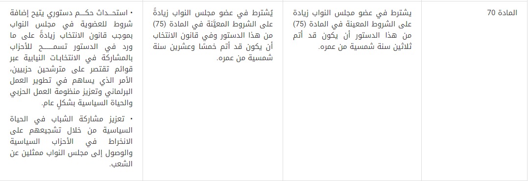 8- قُدمت توصية بتعديل المادة (70) من الدستور لتضاف إلى شروط العضوية في مجلس النواب التي حددتها المادة (75) من الدستور الشروطُ التي ينص عليها قانون الانتخاب. ويتمثل مبرر هذا التعديل في استحداث حكم دستوري يتيح إضافة شروط للعضوية في مجلس النواب بموجب قانون الانتخاب زيادةً على ما ورد في الدستور تسمح للأحزاب بالمشاركة في الانتخابات النيابية عبر قوائم تقتصر على مرشحين حزبيين، الأمر الذي يساهم في تطوير العمل النيابي وتعزيز منظومة العمل الحزبي والحياة السياسية بشكلٍ عام.