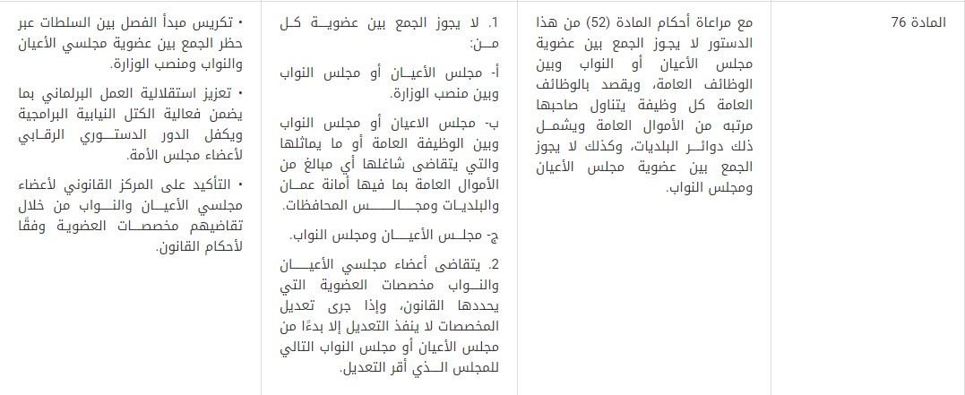 قُدمت توصية بإلغاء حكم الجمع بين عضوية مجلس الأمة والمنصب الوزاري، إذ تم اقتراح تعديل المواد (52) و (64) و(76) بهذا الخصوص. وتمثلت مبررات هذا التعديل في تكريس مبدأ الفصل بين السلطات وتعزيز استقلالية العمل البرلماني بما يضمن فعالية الكتل النيابية البرامجية ويكفل الدورَ الدستوري الرقابي لأعضاء مجلس الأمة.